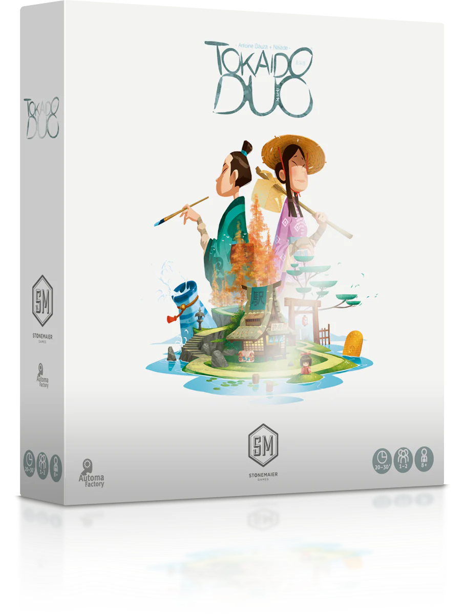 In Tokaido Duo, two players discover the smallest of Japan’s four main islands through a three-faceted spiritual journey. As the pilgrim, visit shrines, gardens, seashores, and hot springs. As the merchant, collect and sell traditional souvenirs. As the artist, paint a variety of beautiful vistas, and gift your paintings to locals. Gain points through each character’s discoveries, and live each journey to the fullest. If you do, your trek will grow into a life-changing experience!